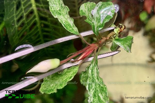 Cố định cây trên đá hoặc lũa bằng keo thủy sinh, tránh vùi thân rễ để ngăn thối.