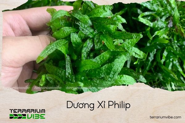 Dương xỉ Philip là loài cây thủy sinh có thân rễ (rhizome) bám chắc vào giá thể như lũa hay đá, tạo nên vẻ tự nhiên trong bố cục. Lá của cây cong và mảnh, khác biệt so với Java Fern thông thường, mang lại nét độc đáo riêng. Màu lá xanh tươi, có thể chuyển từ xanh nhạt đến xanh đậm tùy vào điều kiện ánh sáng.