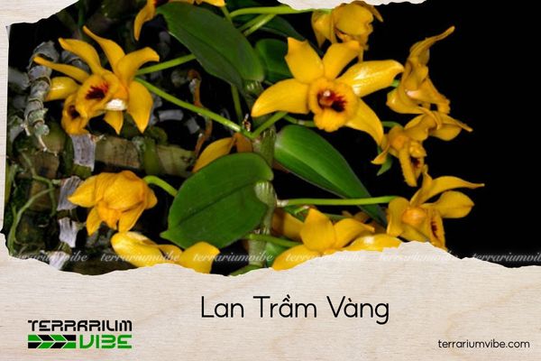Lan Trầm Vàng hợp với terrarium mở hoặc bán mở, đảm bảo ánh sáng và độ thoáng khí. Nên chọn bình đứng hoặc treo để thân lan rũ tự nhiên và hoa khoe sắc nổi bật.